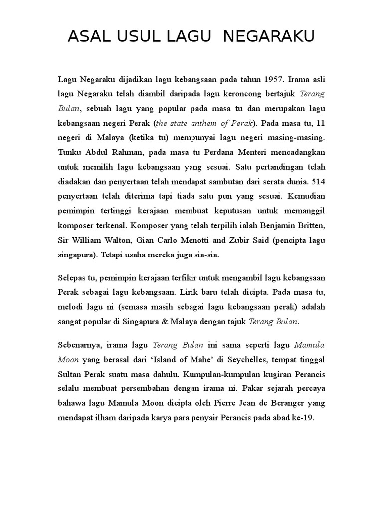 Lagu Negaraku berentak baru itu dimainkan selepas Perdana Menteri Malaysia yang keempat Tun Dr. Assalamualaikum Salam Perpaduan Salam 1 Malaysia Hari ini saya ingin berkongsikan mengenai Asal-Usul Lagu Negaraku. Selama Konfrontasi Indonesia-Malaysia berlangsung orang Malaysia menolak anggapan bahwa lagu Terang Bulan berasal dari Indonesia.
